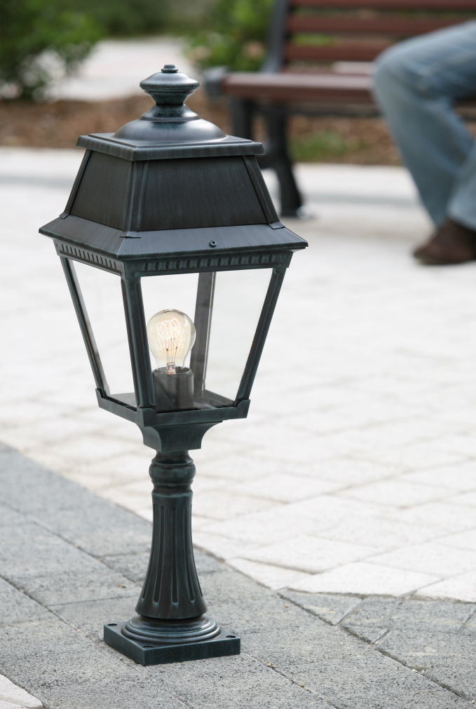 Die Avenue 2 Nr. 06 ist eine klassische Außen-Sockelleuchte mit vierseitiger Laterne und erhöhter Bauform.
