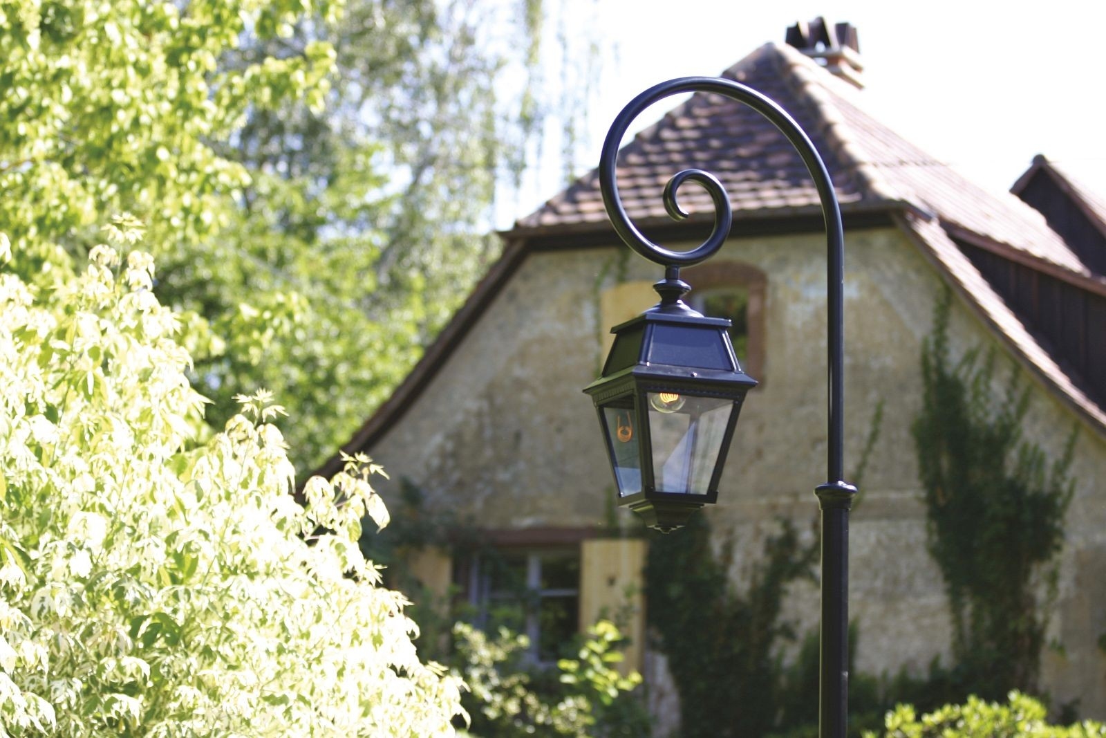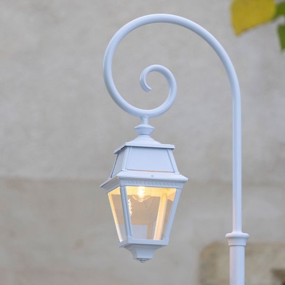 Die Avenue 2 Nr. 08 ist eine klassische Außen-Mastleuchte mit ausladendem Arm und vierseitiger Laterne.