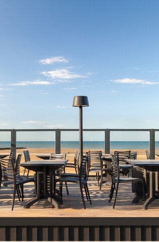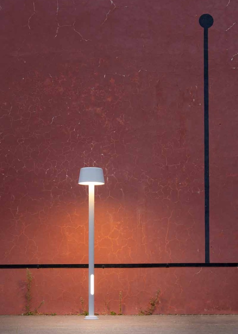 Die Leuchten stehen wie ruhige Lichtkörper im Außenraum und erzeugen klare Linien. Sie strukturieren Flächen und Wege, ohne klassische Laternenwirkung.