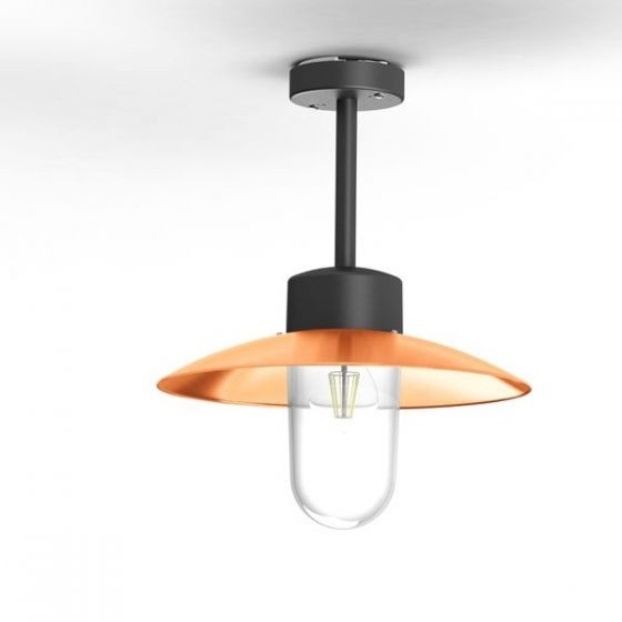Die Belcour N°2 ist eine Außen-Deckenleuchte mit Reflektorschirm aus Kupfer und zylindrischem Glasdiffusor.