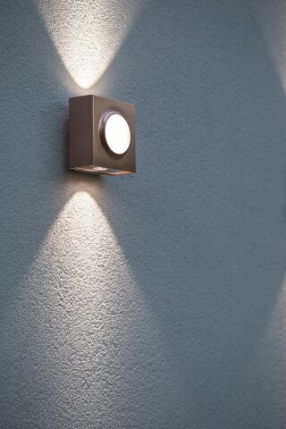 Mit 125 mm Höhe, 125 mm Breite und 77 mm Tiefe gehört sie zu den kleinsten Leuchten im Sortiment. Genau diese kompakte Bauweise sorgt dafür, dass sie sich ruhig in die Fassade integriert und nicht dominant wirkt. Statt große Flächen auszuleuchten, setzt sie gezielte Lichtakzente.
