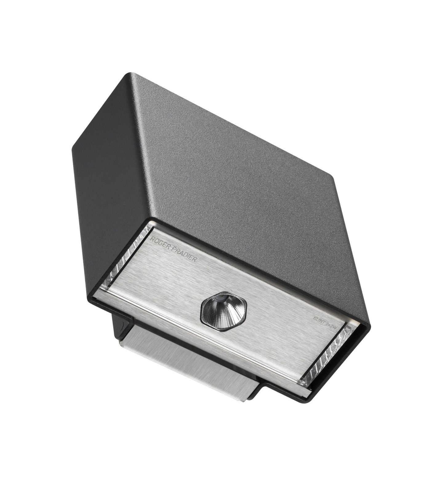 Gefertigt aus Aluminium und ausgestattet mit einem klaren Diffusor erzeugt die Leuchte ein präzises Up-&-Down-Licht. Die Lichtkegel treten definiert nach oben und unten aus und strukturieren die Fassade, ohne flächig zu beleuchten.