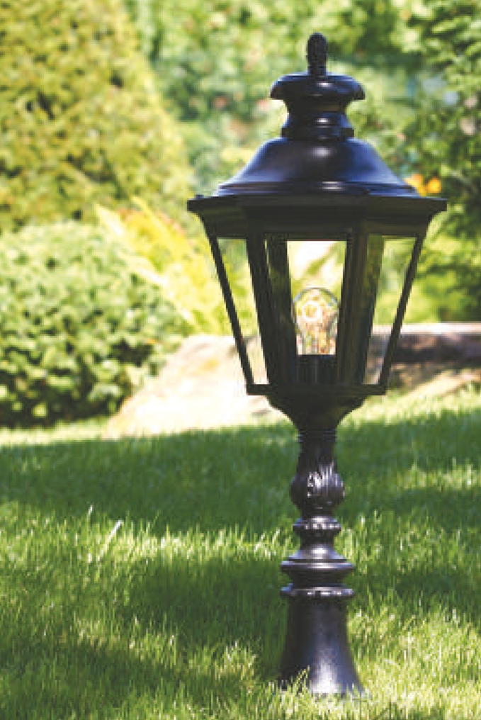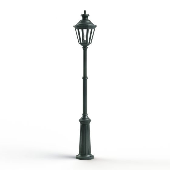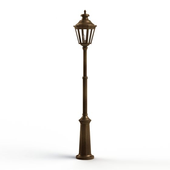 Das geschlossene Oberteil dieser klassisch inspirierten Leuchte sorgt für einen seitlichen Lichtaustritt und ein gezielt nach unten gerichtetes Licht, das Wege und Eingangsbereiche stilvoll illuminiert. Diese hochwertige Außenleuchte ist in Aluminium oder der exklusiven Messingversion verfügbar – letzterer mit einem eleganten, schwarzen Aluminium-Mast für einen edlen Kontrast.