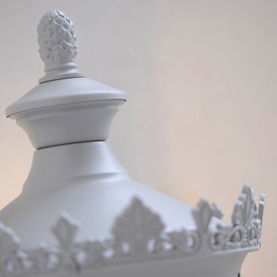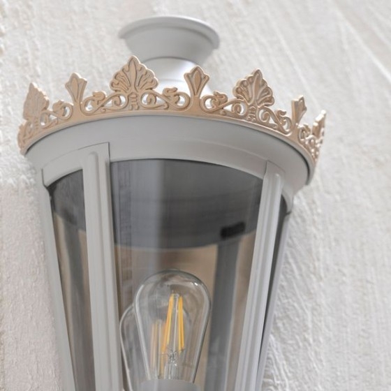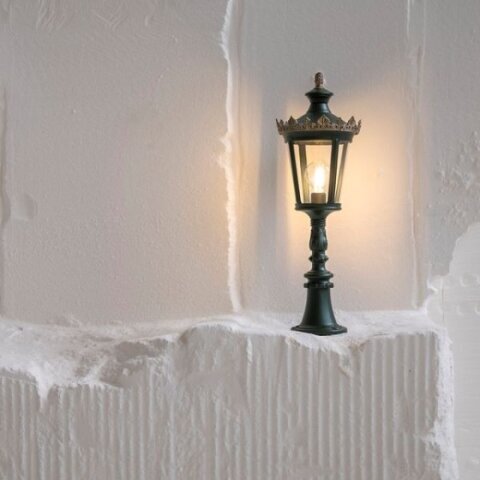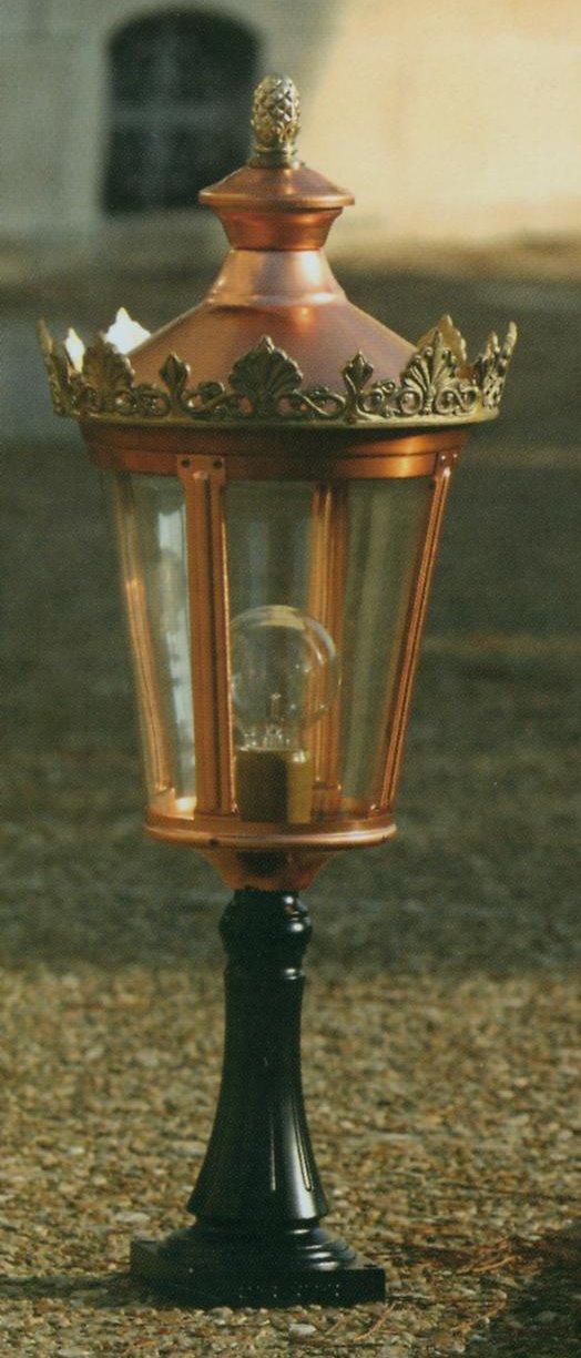 Typisch ist die vierseitige Laterne mit leicht gerundeten Kanten, kombiniert mit einer goldenen Krone als gestalterischem Abschluss.