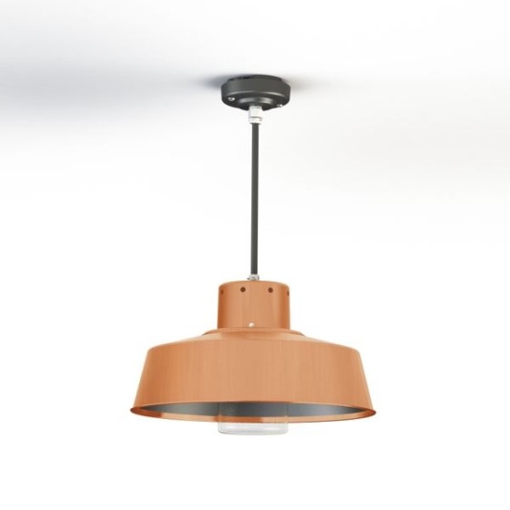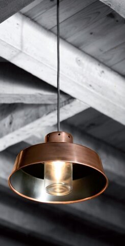 Die Faktory Nr. 2 verbindet funktionales Industrial Design mit der besonderen Wirkung von Kupfer. Der Reflektorschirm mit 346 mm Durchmesser lenkt das Licht gezielt nach unten und erzeugt eine klar definierte Lichtzone.