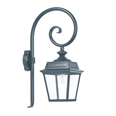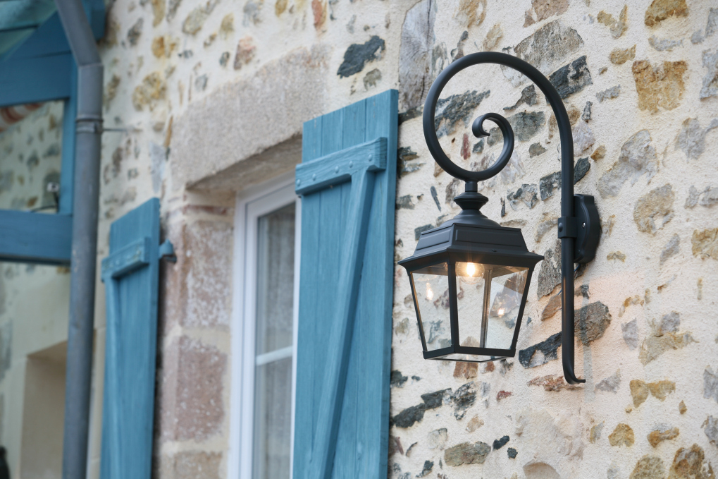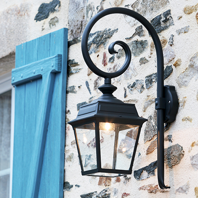 Der Wandarm bleibt traditionell in schwarzem Aluminium ausgeführt – ein klassisches Detail französischer Außenleuchten.