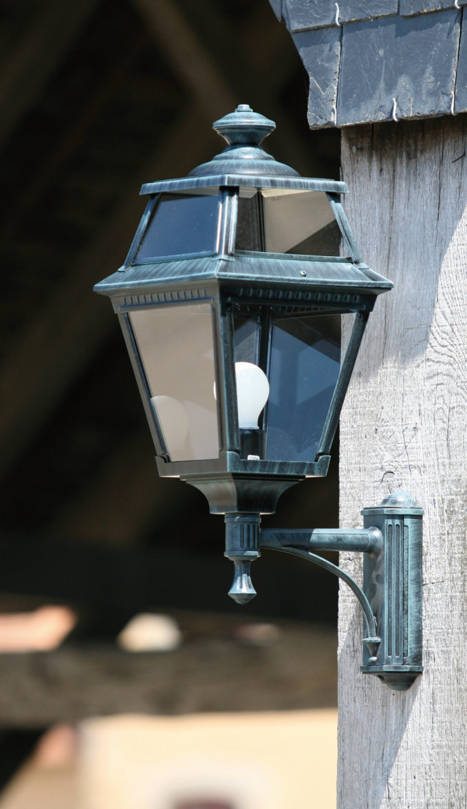 Die senkrecht hängende Laterne wirkt geordnet und klar, während der Wandarm für eine leichte räumliche Distanz zur Fassade sorgt.