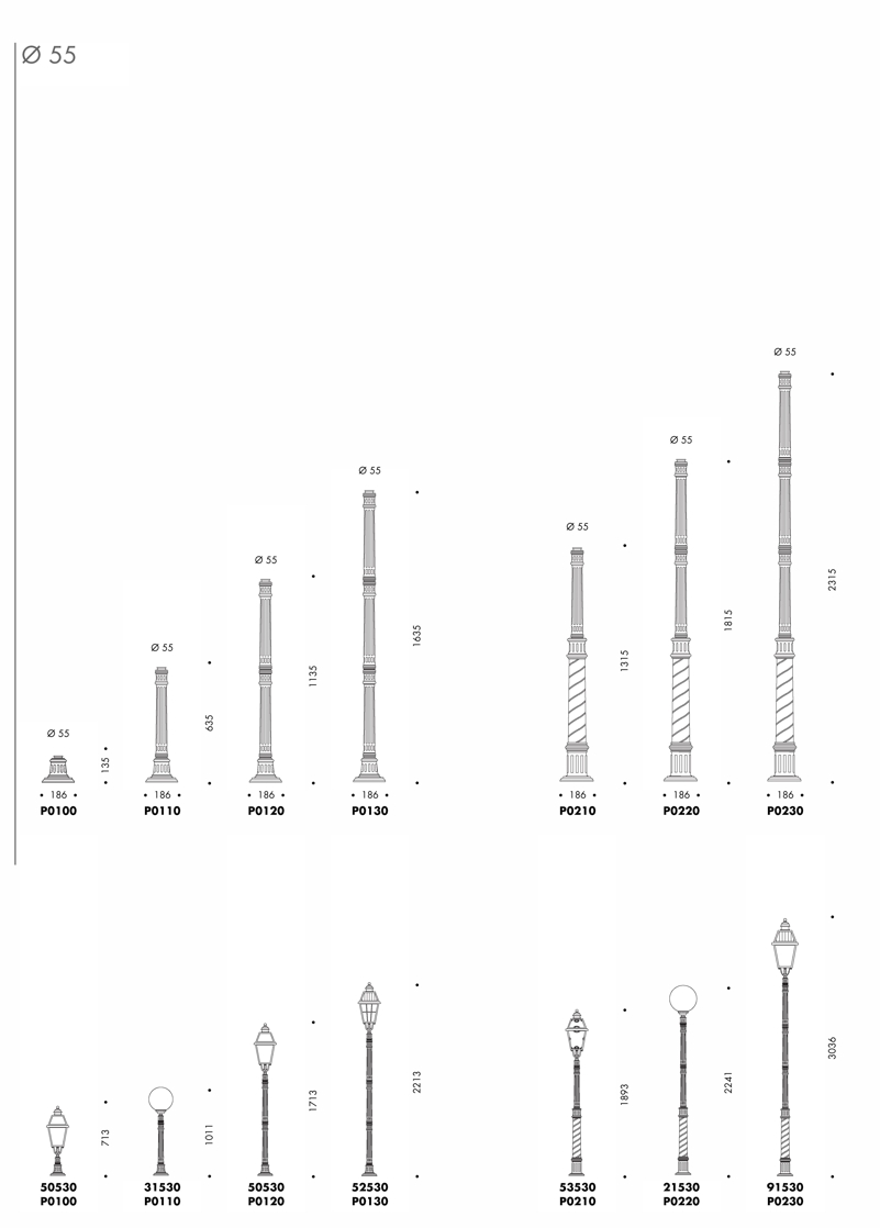 Der Leuchtenaufsatz 54530 ist 578mm hoch und hat eine Breite von 235mm.