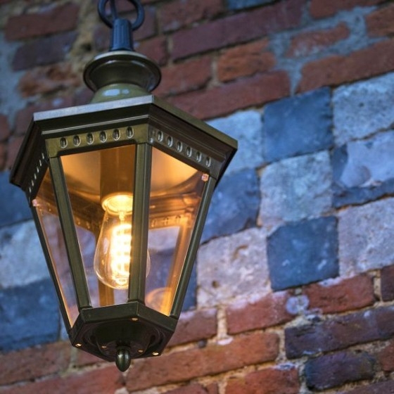 Die Victoria Nr. 02 ist eine klassische Außen-Deckenleuchte mit sechseckiger Laternenform und dekorativer Kettenaufhängung.