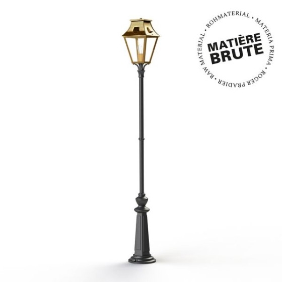 Gefertigt wird die Leuchte aus massivem Messing, kombiniert mit einem stabilen Mast aus lackiertem Aluminium. Sie ist mit einer E27-Fassung ausgestattet und für den Außenbereich mit Schutzart IP44 ausgelegt.