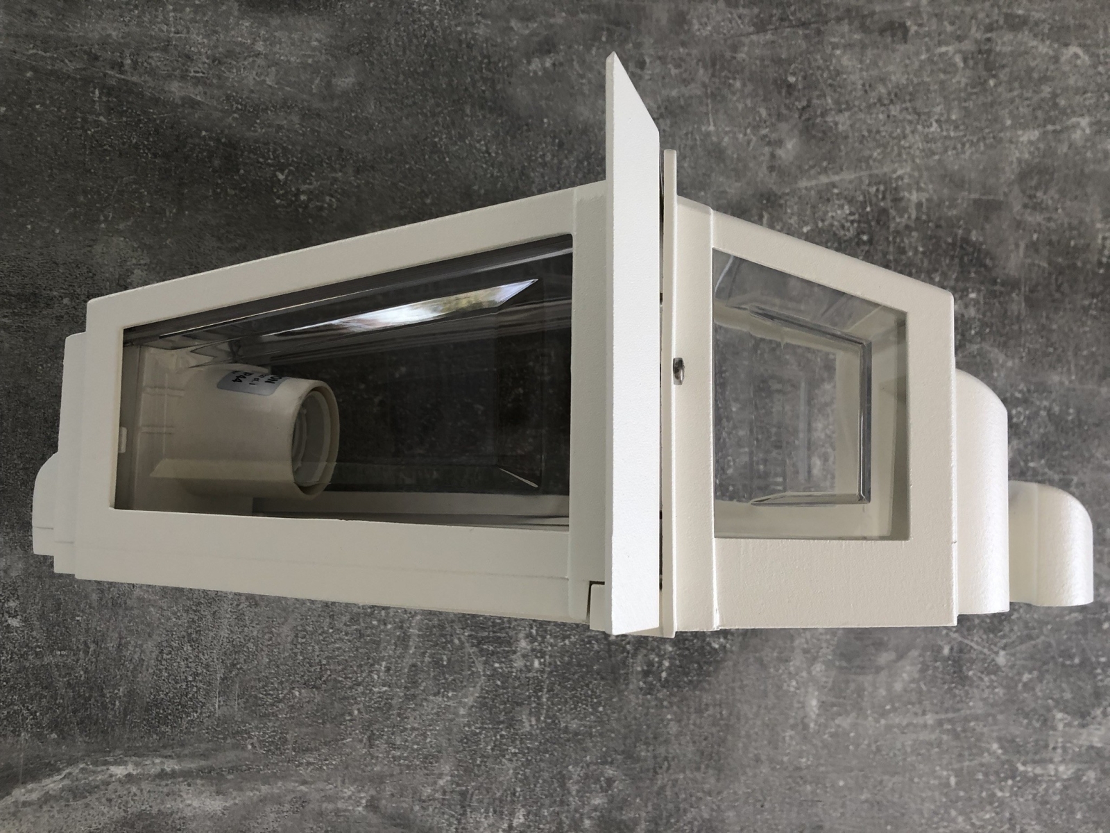 Flache Wandleuchte Aries in der Farbe weiß mit klarem Polycarbonat aus der Leuchten Manufaktur Framon Tradizionale, Italien.